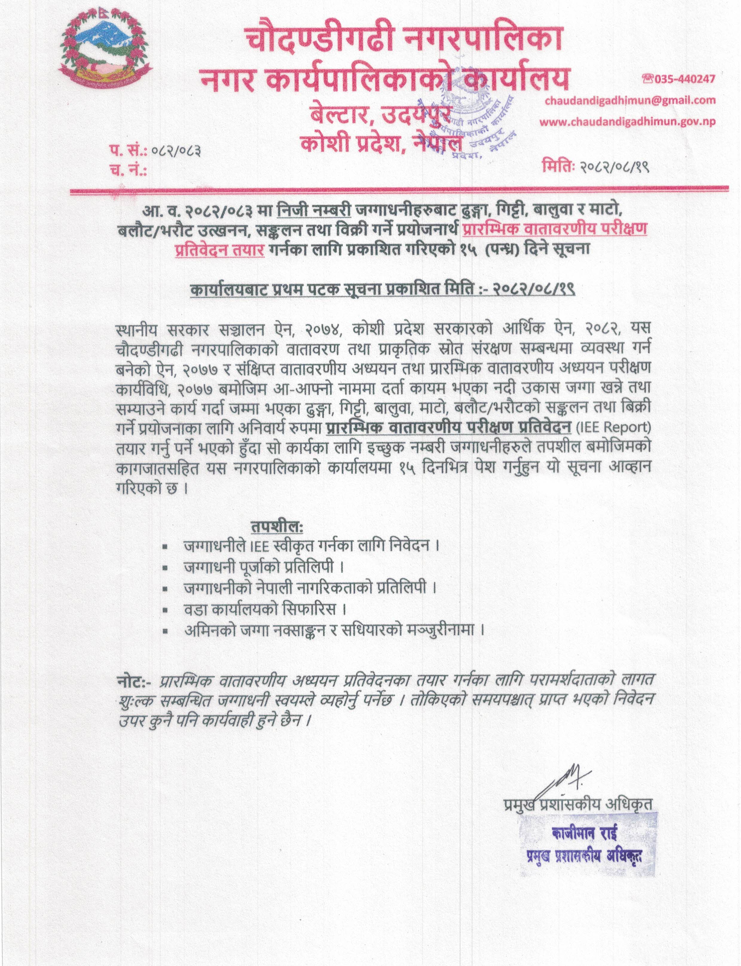 आ. व. २०८२/०८३ मा निजी नम्बरी जग्गाधनीहरुबाट दुङ्गा, गिट्टी, बालुवा र माटो, बलौट/भरौट उत्खनन, सङ्कलन तथा विक्री गर्ने प्रयोजनार्थ प्रारम्भिक वातावरणीय परीक्षण प्रतिवेदन तयार गर्नका लागि प्रकाशित गरिएको १५ (पन्ध्र) दिने सूचना ।