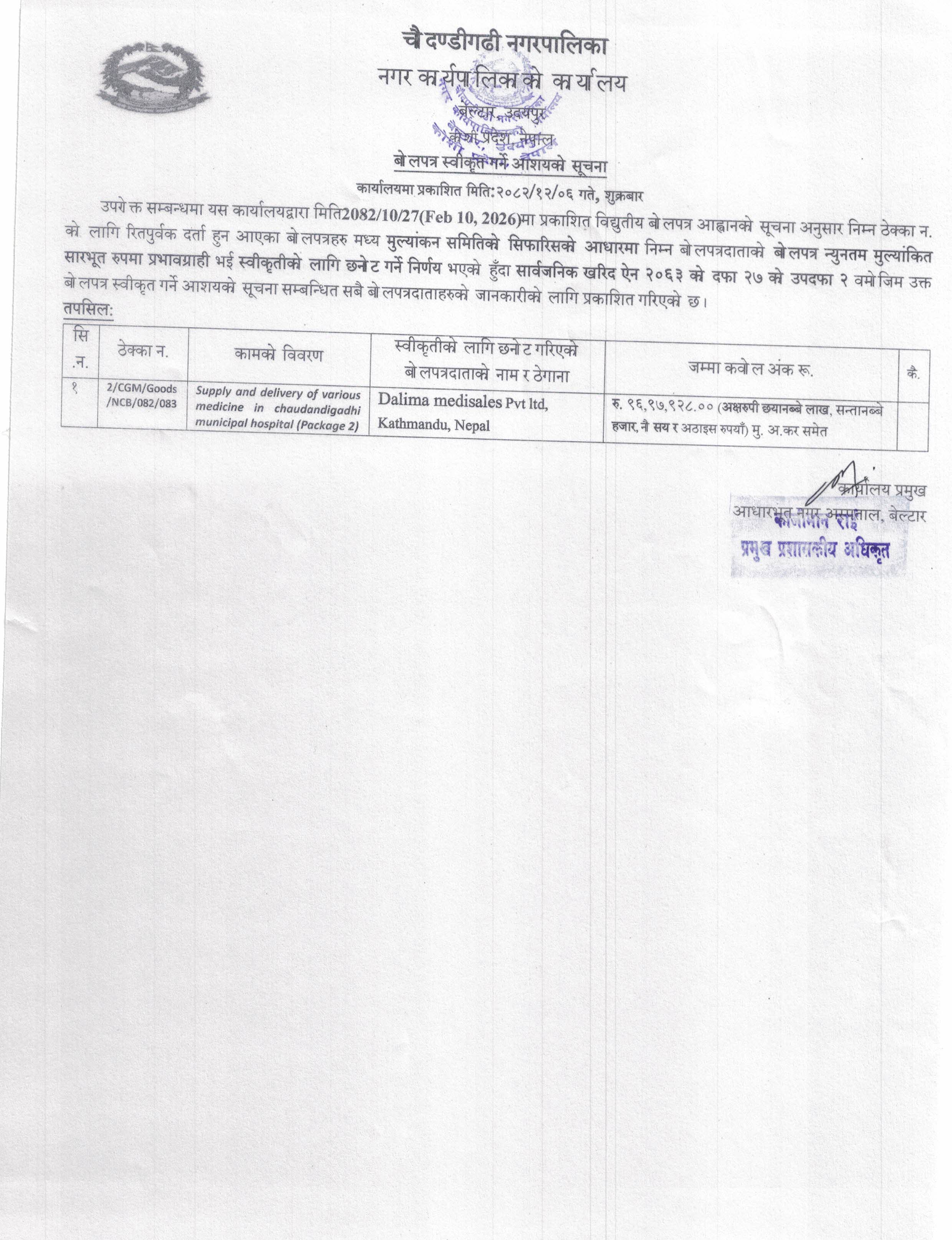 बोलपत्र स्वीकृत गर्ने आशयक सूचना